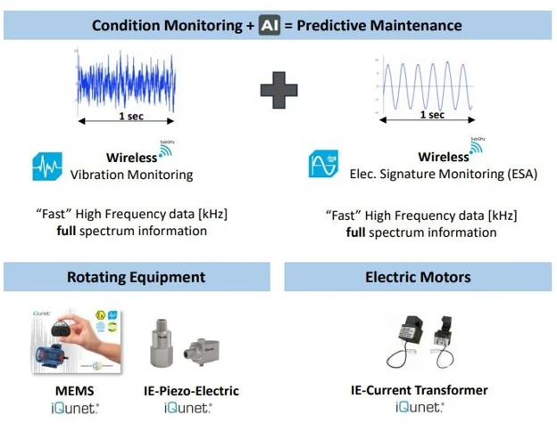 - Wireless sensors monitor vibration, temperature, and other machine indicators